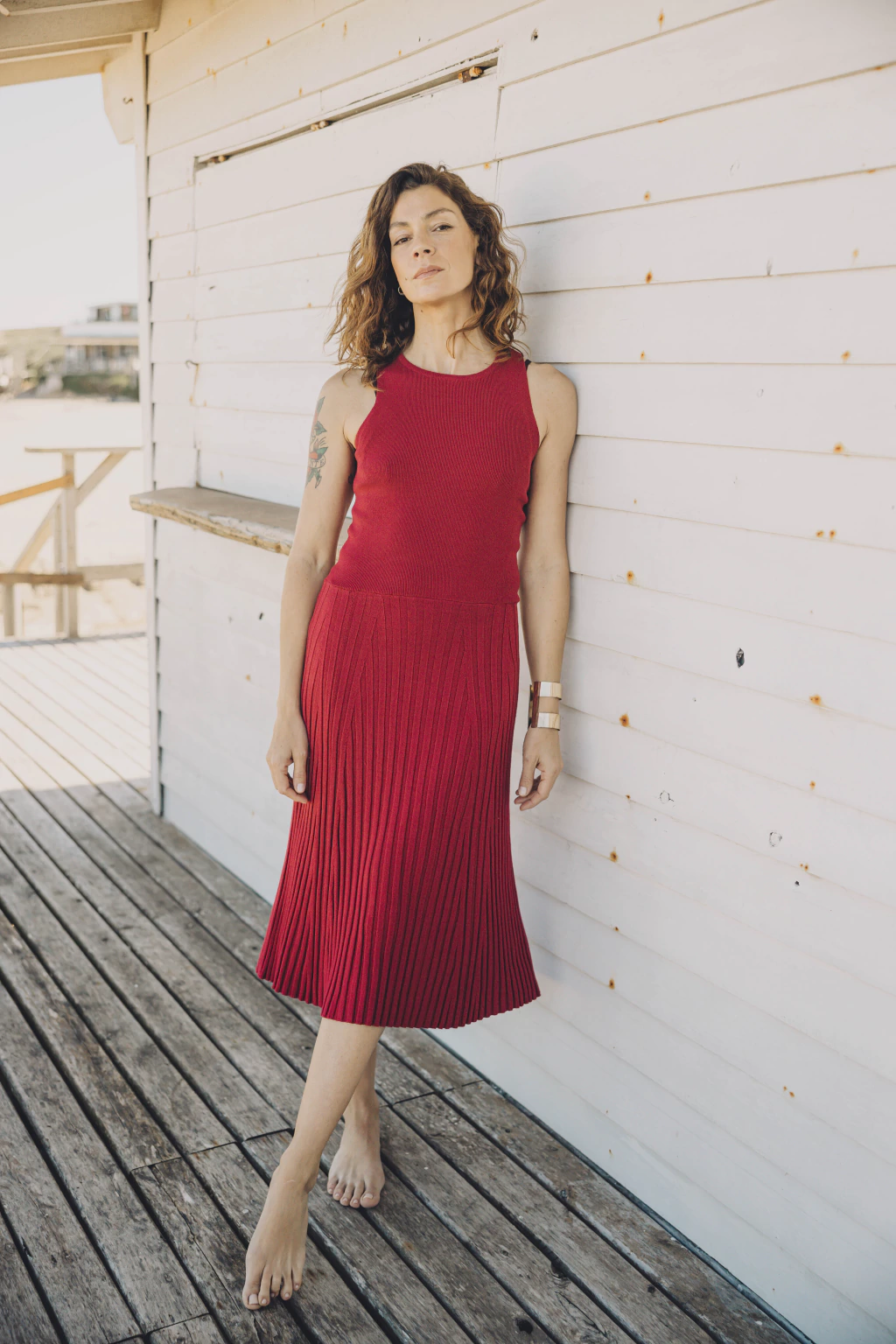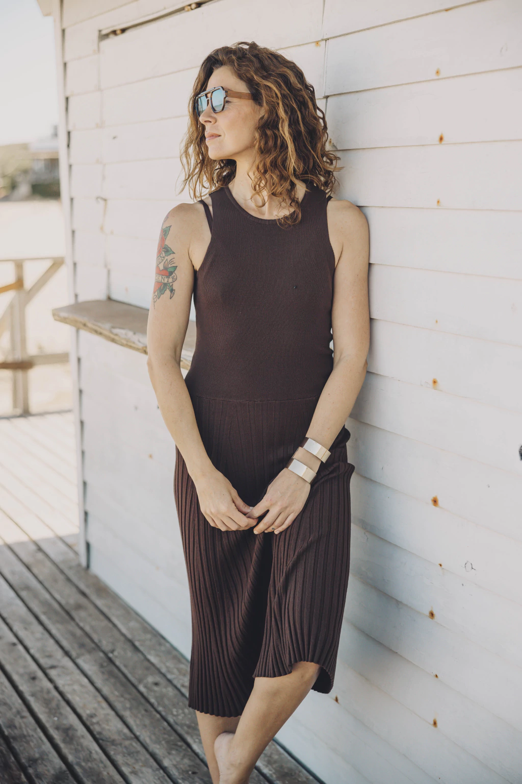Este vestido largo estilo musculosa se destaca por su falda plizada, que aporta un movimiento fluido y femenino, realzando tu silueta con un toque de distinción. La textura suave y elástico del tejido aseguran un calce cómodo y adaptable, mientras que el diseño sin mangas ofrece frescura y libertad de movimiento.